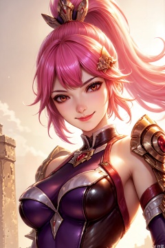 score_9_up,score_8_up,HML,1girl, solo, long hair, breasts, looking at viewer, smile, bangs, hair ornament, red eyes, medium breasts, closed mouth, ponytail, pink hair, detached sleeves,armor, leotard, lips, backlighting,(portrait)