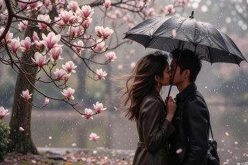 This image depicts a romantic scene:two people walking under magnolia trees, holding an umbrella.The background is filled with blooming magnolia with petals falling in the wind,creating a dreamy and tranquil atmosphere.magnolia often symbolize the arrival of spring and the fleeting beauty of life,and the magnolia in the rain add a poetic and romantic touch.