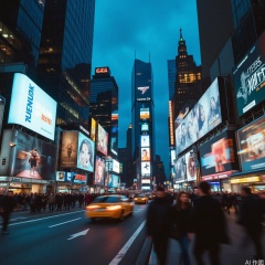 the bustling city, the night sky is like a piece of blue silk dyed with ink. The towering buildings cast a cold white light, outlining their tough silhouettes, and the neon billboards shine with a riot of five colors. On the main roads, cars are like silver fish shuttling through, and the lights flicker like a tide. Pedestrians come in various forms, with white-collar workers in a hurry, street artists immersed in their performances, and lovers sweetly accompanied. The glass curtain walls reflect a fantastical scene, and the ancient bell tower appears old and quaint. Light and shadow collide, creating a visual impact.,motion blur effect,cinematic texture background,dynamically blurred background,Quick movement of people
