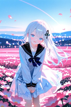 (cinematic lighting:0.4),(pastel color \(medium\):1.0),adorable,1girl standing on a vast flower field, pale-white hair, hair ornament, (wavy long hair),lace white serafuku dress,landscape,beautiful blue sky,head tilt,bloom effect,fantastic atmosphere,overlooking magnificent view,open mouth smile,wind,(petals),optical flare,v-arms,leaning forward,the light gives off a dreamy glow,blurred edges,bokeh,front view,blurry,(depth of field:1.2),