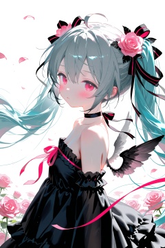 acid,loli,1girl, solo, long hair, hair ornament, flower, twintails, dress, hair flower, ribbon, black dress, looking at viewer, hair ribbon, red eyes, grey hair, white background, bare shoulders, very long hair, detached sleeves, choker, hair between eyes, petals, pink flower, strapless dress, strapless, from side, simple background, upper body, rose, breasts, wings, red ribbon, ahoge, floating hair, pink eyes, small breasts, frills, collarbone, parted lips, looking to the side, hatsune miku, ribbon choker, pink rose, black ribbon, standing, closed mouth, pink ribbon, black choker, bow, frilled dress