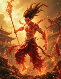 danezha,(masterpiece:1.4),(traditional Chinese painting style:1.3),***** Nezha bursting with spiritual flames,molten lava patterns on bare torso,(fierce glare:1.6),crimson energy radiating from facial marks,flaming spiked hair whipping violently,wielding blazing spear in dynamic thrust pose,(energy shockwaves:1.5),collapsing temple ruins background,ink splatter effects simulating motion,8k cinematic lighting,<lora:lora.by_tusi:1>,