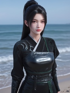 realistic style photo outstanding style,tall,cute,in her teens. Use soft lighting to cast gentle shadows on the subject,adding a touch of dimension to your images without compromising details,score_9,score_8_up,score_7_up,Seaside,beach,waves,<lora:剑来-宁姚黑衣Pony:0.65>,black hair in high ponytail adorned with a delicate hairpin,dark,form-fitting outfit,long sleeve,black tunic with intricate silver designs,black skirt with a high waist,