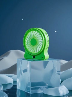 BKCJ, A high-quality, high-resolution photograph of a vibrant, neon-green portable fan with a foldable design, sitting on a block of ice. The fan has adjustable blades and a USB charging port, perfect for staying cool on the go. The background showcases an icy desert with sand dunes and a starry night sky, blending heat and cold in a surreal contrast. The lighting is moody, casting long shadows that add depth to the fan's compact form. The fan is centered, with ice reflecting the faint starlight.