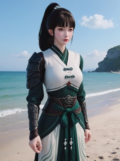 realistic style photo outstanding style,tall,cute,in her teens. Use soft lighting to cast gentle shadows on the subject,adding a touch of dimension to your images without compromising details,score_9,Seaside,beach,waves,<lora:剑来-阮秀Pony:0.6>,black hair is tied up in a high ponytail adorned with a decorative hair clip,wears a traditional Chinese-style outfit with a white tunic and a dark green,high-collared outer garment.The outfit is intricately designed with ornate silver and black metal plates,resembling armor,on the shoulders and forearms,and a sash tied around her waist.,