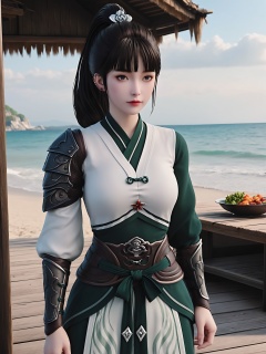 realistic style photo outstanding style,tall,cute,in her teens. Use soft lighting to cast gentle shadows on the subject,adding a touch of dimension to your images without compromising details,score_9,Seaside,beach,waves,<lora:剑来-阮秀Pony:0.6>,black hair is tied up in a high ponytail adorned with a decorative hair clip,wears a traditional Chinese-style outfit with a white tunic and a dark green,high-collared outer garment.The outfit is intricately designed with ornate silver and black metal plates,resembling armor,on the shoulders and forearms,and a sash tied around her waist.,