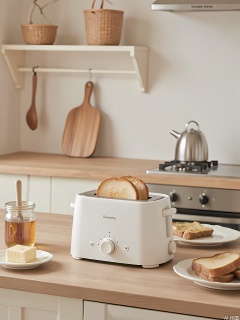 CFCJ, Photograph of a minimalist kitchen with a white toaster on a light wood countertop. The toaster is toasting slices of bread. The countertop has a butter dish, a jar of honey, and a plate of toast. In the background, there are open shelves with bread baskets, a stainless steel kettle on a stove, and a few wooden utensils. The lighting is bright, casting a warm glow. The overall aesthetic is simple and comforting.
