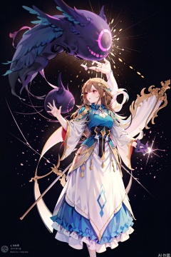 1girl, solo, long hair, red eyes,mythic character,Glowing Dreamlike Style.in the style of digital art. This image showcases an ethereal,fantastical figure set against a deep,starry night sky. The central subject is adorned with an elaborate,opulent costume that blends celestial elements with ornate,flowing fabric. The figure's silhouette is shrouded in darkness,making its form indistinct,yet its outfit gleams with intricate designs. The ensemble features a high collar,adorned with gold and gem-like embellishments,cascading into a flowing,ruffled train that appears almost like an extension of the night sky,with hues of white,blue,and purple. Star-like sparkles are scattered throughout,enhancing the celestial theme. The figure's right hand holds a golden staff topped with a radiant star,symbolizing power or guidance. The background is a mesmerizing,gradient blend of black and deep blue,punctuated by stars and galaxies,giving a sense of vastness and mystery. The artwork combines elements of fantasy and cosmic themes,executed in a vibrant,almost luminescent style,with rich textures and delicate details that highlight the mystical and enchanting essence of the character.character:Nolva