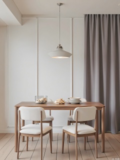 CTZX, A Scandinavian dining room with a minimalist aesthetic, featuring a light wood table and four chairs with white upholstery and natural wood legs. The chairs have a simple, understated design. The table is set with a small glass bowl of seashells and a set of white ceramic plates. A pendant light with a linen shade hangs above the table, casting a soft, natural light. The background wall is painted in a pale gray, and the floor is covered in light wood planks. The overall style is clean and uncluttered, with a focus on natural materials and a neutral color palette.