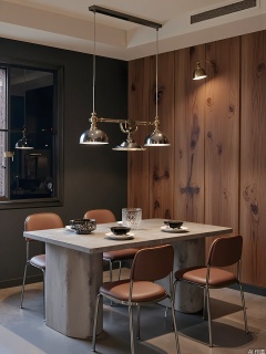 CTZX, A contemporary dining room with an industrial-chic aesthetic, featuring a concrete table and four chairs with leather seats and metal frames. The chairs have a sleek, minimalist design. The table is set with a geometric glass vase and a set of black and white ceramic plates. Three pendant lights with exposed bulbs and metal shades hang above the table, casting a harsh, industrial light. The background wall is made of reclaimed wood, and the floor is covered in polished concrete with a textured finish. The overall style is edgy and urban, with a focus on raw materials and a utilitarian design.