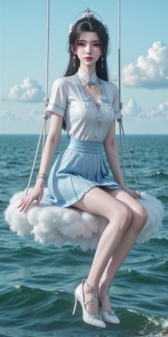 真人肌肤纹理, 4K画质,完美身材,long legs,Film texture, film and television, surrealism, a girl with a delicate face is sitting on a cloud swing. The girl is wearing a jk sailor uniform, a white short-sleeved shirt, light blue stripes trimming, a light blue tie, white blue pleated skirt, exquisite diamond-encrusted high heels, swing rope The sub is connected to a cloud in the sky, the background is a vast ocean, the water shows a consistent blue-green tone, the sky is also blue-green, blending with the ocean, perfect light and shadow, hyper-realistic photography, sharpening, artistic conception, Consciousness, large areas of blank space, sense of space, haziness, dreams, fog,