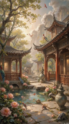 masterpiece, best quality, (impressionist oil painting in Monet's style), (sunlit traditional Chinese courtyard), intricate wooden pavilions with upturned eaves, (red lacquered columns), carved lattice windows, (stone pathways lined with blooming peonies), water lilies floating in a marble pond, (swaying bamboo groves), (dappled sunlight through ginkgo leaves), soft golden hour lighting, (diffused natural light), (impressionist brushstrokes with thick impasto), (blurry garden bokeh in background), (celestial patterns on stone lanterns), (exquisite tile roofs with auspicious animal statues), (exotic parrots perched on stone railings), (romantic ambiance), (airy brushwork), (pastel color palette of indigo, coral, and jade), (depth of field), (realistic oil texture), (balanced composition), (celestial atmosphere), (natural light enhancing details), (subtle mist effects), (romanticism style), (lush peony blooms in foreground), (detailed stone carvings), (vintage ceramic vases with calligraphy), (light and shadow contrast), (gothic architecture details), (molten sky), (natural light), (romantic style), (soft focus effect), (natural textures), (colorful koi fish), (hellish sky), (natural beauty), (romantic background), (soft light), (natural elements), (colorful environment), (hellish scene), (natural lighting), (romantic atmosphere), (soft shadows), (natural textures), (colorful magma), (hellish sky), (natural beauty), (romantic style), (soft focus effect), (natural textures), (colorful flames), (molten meadow), (natural light rays), (romantic style), (soft focus), (natural beauty), (colorful magma), (hellish sky), (natural environment), (romantic background), (soft light), (natural elements), (colorful flames), (hellish scene), (natural lighting), (romantic atmosphere), (soft shadows), (natural textures), (colorful magma), (hellish sky), (natural beauty), (romantic style), (soft focus effect), (natural textures), (colorful flames), (molten meadow), (natural light rays), (romantic style), (soft focus), (natural beauty), (colorful magma), (hellish sky)