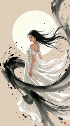 Ink and wash abstract concept blockbuster, girl's moon white dress and ink strokes blend, hair presents a calligraphic white effect, solid color background highlights silk luster, asymmetric composition breaks tradition, high-speed synchronous flash solidified clothing fluctuations