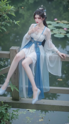 Action: A young woman elegantly sits sideways on a wooden bridge railing, with one hand lightly touching her collar and the other naturally resting on the railing, in a leisurely posture. Show your legs. Long and slender legs. Nail.