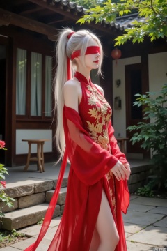 In the ancient courtyard with dappled sunshine, a white haired girl stands quietly. She was dressed in a bright and fiery Hanfu, with exquisite embroidery and flowing skirt, showcasing the splendor of traditional clothing. High ponytail. Ribbon. Blindfold. Elegant and graceful. Tie a ribbon around your hair.