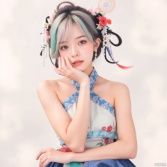 1 woman,realistic,halter_dress,flower,colorful hair,colorful eyes