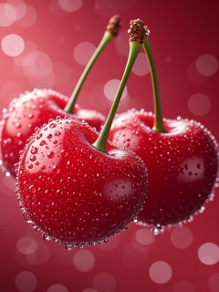 miluo_sgjh,Fruits,water splashes,Photo of three red cherries with water droplets on their surfaces, set against a soft, blurred red background with bokeh lights. The cherries are arranged in a triangular formation, with one in the center and two on either side. The texture of the cherries is smooth and glossy, with small droplets of water glistening on their surface. The lighting is soft and warm, highlighting the vibrant red color of the fruit. The overall effect is one of freshness and beauty.,<lora:miluo丨秀色可餐爆汁水果:1>