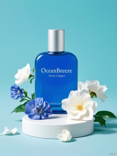 HHCJ, Rendering of a cobalt blue bottle of OceanBreeze cologne, standing on a seashell-adorned stand, surrounded by sea lavender and coral bells. The bottle bears "OceanBreeze" with "Fresh Cologne" in silver. The backdrop is a cool aqua, dotted with indigo blossoms and silver-gray leaves. Natural, coastal light accentuates the bottle’s glassy finish and the ocean-inspired palette.