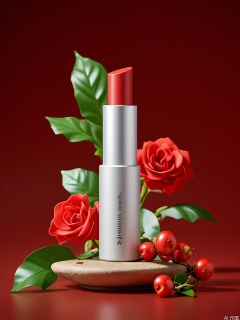 HHCJ, Visual of a matte silver tube of VelvetLuxe lipstick, perched on a ceramic dish, flanked by deep red roses and holly berries. The tube is stamped with "VelvetLuxe" and "Matte Lip Color" in bold crimson. The scene unfolds against a rich burgundy backdrop, with glossy green leaves adding contrast. Warm, ambient lighting enhances the lipstick’s metallic sheen and the berries’ vibrant hues.