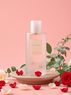 HHCJ, Depiction of a frosted pink bottle of RosePetal perfume, perched on a vintage tray, amidst rose petals and eucalyptus branches. The bottle is labeled "RosePetal" with "Floral Fragrance" in gold. The backdrop is a soft blush pink, scattered with crimson rose petals and silver-green leaves. Soft, candlelit glow enhances the perfume’s delicate scent and romantic aesthetic.