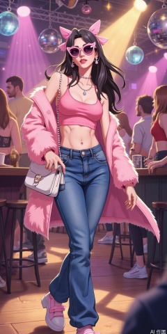 "The 2000s Y2K-style girl, wearing low-waist jeans and a navel-open top, paired with a pink fur coat and thick-soled sponge shoes, wearing butterfly-shaped sunglasses and beaded mobile phone chains. The background is a retro disco, with a flashing laser ball light, bright colors, slightly grainy film filters, illustration style, full of nostalgic millennial atmosphere."