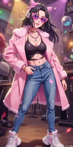 "The 2000s Y2K-style girl, wearing low-waist jeans and a navel-open top, paired with a pink fur coat and thick-soled sponge shoes, wearing butterfly-shaped sunglasses and beaded mobile phone chains. The background is a retro disco, with a flashing laser ball light, bright colors, slightly grainy film filters, illustration style, full of nostalgic millennial atmosphere."