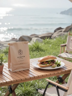 YLCJ, A serene outdoor scene featuring a wooden picnic table with a brown paper bag labeled "Sibuya Coffee" on the left side, a plate with a sandwich and a side salad, and a small potted plant. The table is situated on a lush green lawn with a tranquil, expansive view of a calm sea and distant rocky shoreline in the background. The sky is clear with a light blue hue. A beige folding chair is positioned near the table. The overall ambiance is peaceful and inviting, perfect for a relaxing meal by the coast.