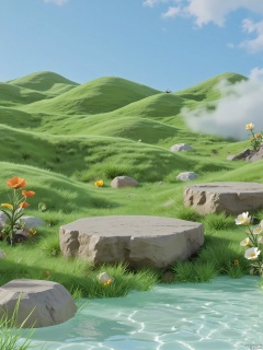 YLCJ, A serene, fantasy landscape with lush green hills, a small, clear blue stream, and two large, flat rocks in the foreground. The sky is bright blue with scattered white clouds, and a soft, warm light illuminates the scene. The ground is covered in vibrant green grass and dotted with colorful wildflowers, including orange and yellow blooms. The atmosphere is peaceful and inviting, with a sense of tranquility and natural beauty. The image has a soft, dreamy quality, with a slight blur effect that enhances the ethereal feel.