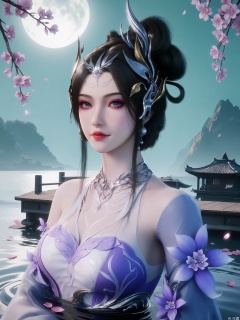 score_9,score_8_up,score_7_up,incredibly absurdres,realistic,1 girl,solo,high_quality,looking_at_viewer,(pale_skin),1 girl,solo,hair_ornament,moon,petals,flower,makeup,cherry_blossoms,jewelry,delicate_water_surface,splashing_water,water_ripples,lake,moonlight,flower_sea,bright_lighting,bright_environment,black hair,