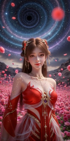 , DSLR Quality,Depth of field ,looking_at_viewer,Dynamic pose, , kind smile,1girl , 8k resolution, Masterpiece quality, High detail. from below, Fantasy theme, cropped. {(1 girl:1.5),(close to viewer:1.8), ((looking at viewer:2), beautiful face, ), ((worm's eye shot:1.2)),perspective distortion}, (Panoramic view, fisheye lens effect:1.1). {(Strong backlighting, underexposure:1.4), (blocked shadows:0.8), depth of field(at 100mm focal length:1.2)}, (horizon:0.7), low key earth. the starry sky feathering into the background, creating a sense of depth and gradient. Incorporating Droste Effect(an endless repetition and reflection:1.2). Surrounded by fluttering rose petals, reflected or casting dramatic shadows and highlights, {(meteor shower, planets:1.1), (Vermilion Comet:1.3)}. mesmerizing effect, a dreamlike ambiance of infinity. A vortex of rose petals, a starry sky vortex, , as, vortex, tyjf,huolinger,brown hair,hair ornament,red dress