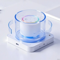 3DTB, A modern glass 3D icon of a smart home assistant. The device is a compact cylinder with a touch-sensitive surface and a ring of colorful LED lights that indicate different functions. The icon is presented on a simple white background, highlighting its minimalist and intuitive design.