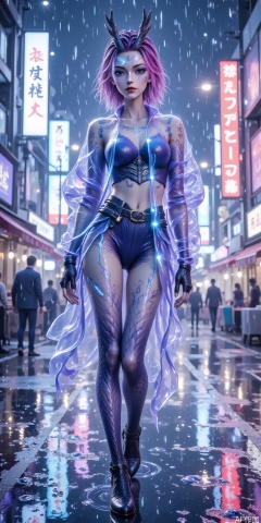 "A fashionable beauty in cyberpunk style, wearing a fluorescent blue-purple transparent jacket, mechanical tights inside, luminous circuit tattoo on her arms, neon pink highlighted short hair, and holographic projection goggles. The background is Tokyo streets on rainy nights, neon signs and holographic billboards flash, wet ground reflects colorful light and shadow, cyberpunk 2077 style, super realistic 8K details, movie-level light and shadow."