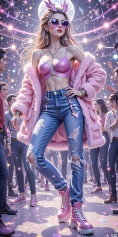 "The 2000s Y2K-style girl, wearing low-waist jeans and a navel-open top, paired with a pink fur coat and thick-soled sponge shoes, wearing butterfly-shaped sunglasses and beaded mobile phone chains. The background is a retro disco, with a flashing laser ball light, bright colors, slightly grainy film filters, illustration style, full of nostalgic millennial atmosphere."