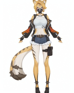 8k,best quality,masterpiece,(ultra-detailed),(high detailed skin),(by nanoless, by misumi \(macaroni\),:0.5),A full-body portrait of a young girl,standing gracefully,pastel art style,high-key lighting,shoujo manga influence,hd quality,delicate details,full body,full shot,standing,looking at viewer,(solo:1.2),simple background,white background,<lora:Pulchra-sd-Tanger-000019:0.8>,pulchra fellini \(zenless zone zero\),clothes: pulchra def clothes,cheetah girl,fur skin,furry,1girl,animal ears,tail,fingerless gloves,jacket,short hair,mask,shorts,belt,blonde hair,open jacket,cutoffs,midriff,thigh strap,full body fur,