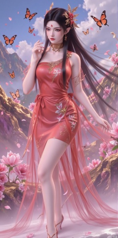 An ancient fairy with flowing black hair like a waterfall, lightly held by a peach blossom hairpin, with red butterflies fluttering in her hair, adding passion and liveliness. She wears a fiery red gauze dress embroidered with blooming peach and cherry blossoms, paired with exquisite red high heels, showcasing passion and ethereal charm. Standing in a sea of spring flowers, surrounded by blooming peach, cherry, and pear blossoms, with petals drifting in the wind, butterflies fluttering around her skirt, as if sharing the romance and dreaminess of spring. Her expression is gentle and lively, her eyes filled with ethereal charm, as if she were the embodiment of a spring spirit.