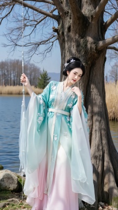 The background is a large tree with clear tree trunk texture, and next to it is a water area with slight ripples on the surface. In the distance, dry yellow grass and trees can be seen, presenting a natural scenery of autumn and winter seasons. The background color tone tends to be natural and simple, complementing the fresh and elegant characters, creating a peaceful and distant atmosphere.hand
