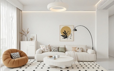 ZJF, A minimalist living room with a modern aesthetic. The space features a beige sectional sofa adorned with geometric and floral pillows, centered against a light wall. Above the sofa, a large, abstract artwork with a golden sun and black leaf design hangs. To the left, a small white console table holds a vase with dried flowers and a framed photograph. A tan, curved armchair sits to the left of the sofa. A white, round coffee table with a geometric design is placed in front of the sofa. A large, floor lamp with a white shade stands near the sofa. The room is illuminated by a modern, circular ceiling light. The floor is covered with a patterned rug in black and white.