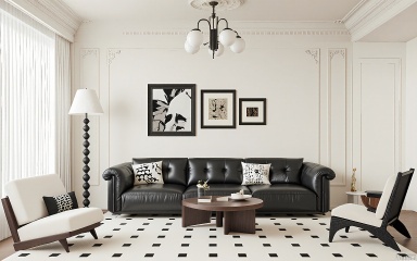 ZJF, A stylish, modern living room with a minimalist design. A black leather sofa adorned with white geometric patterned cushions is centered against a cream-colored paneled wall. Above the sofa, three abstract black and white art pieces are hung. A black and white patterned rug lies on the floor in front of the sofa. To the left, a tall, thin floor lamp with a white shade stands. A small, round wooden coffee table with a glass top is positioned in front of the sofa. A wicker chair with a beige cushion sits to the right. The room is illuminated by a chandelier with white globes.