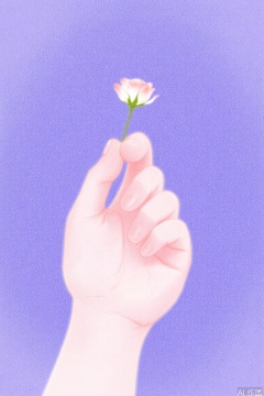 The image depicts a hand holding a small, delicate rose. The background is a textured purple, giving a soft, almost ethereal feel to the scene. The hand is pink and appears to be gently holding the flower, creating a sense of tenderness and care. The overall composition is simple yet evocative, with a focus on the delicate beauty of the flower against the calming blue backdrop.