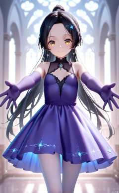 masterpiece,very aware,highres,absurdres,newest,best quality,high quality,loli,chromatic_aberration,Light Blue Theme,//,1girl, solo, white_pantyhose,gloves, pantyhose, dress, white pantyhose, elbow gloves, long hair, purple dress, ponytail, purple gloves, looking at viewer, smile, purple hair, ballet, black hair, blush, ballerina, yellow eyes, blurry background, forehead, bare shoulders, closed mouth, see-through, outstretched arms, very long hair, blurry, reaching towards viewer, reaching, sleeveless, blue dress, sparkle, brown eyes//,year_2023,year_2024,buzhidao228 style,//,official art,depth of field,detailed light,blurry background,cinematic lighting,ray tracing,ultra detailed,god rays,backlighting,photo background,chromatic aberration,volumetric lighting,depth of field,blurry background,cinematic lighting,very aesthetic,,