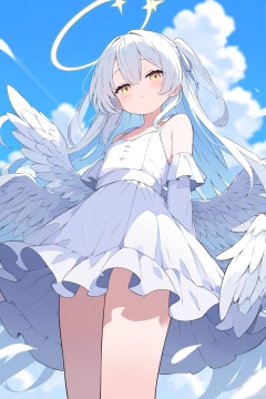 masterpiece,best quality,amazing quality,very aesthetic,absurdres,newest, 1girl, solo, wings, dress, long_hair, white_dress, looking_at_viewer, sky, white_wings, detached_sleeves, cloud, angel_wings, long_sleeves, white_hair, yellow_eyes, frilled_dress, outdoors, hair_between_eyes, bare_shoulders, closed_mouth