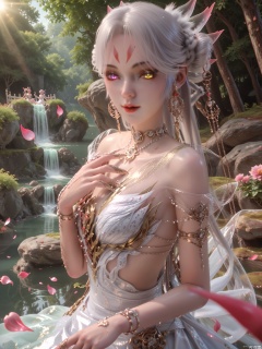 score_9,score_8_up,score_7_up,1girl,looking_at_viewer,realistic,1girl,Vivid Colors,bright environment,sunshine,god light,lake,delicate water surface,shiny skin,shiny hair,reflection,(wariza:1.2),dress,jewelry,flower sea,falling petals,extreme detail description,bright sunlight,bright_pupils,frontal lighting,(upper body:1),put one hand on your chest,yellow eyes,facial mark,forehead mark,fingernails,sharp fingernails,heterochromia,white hair,