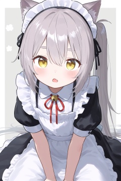 1girl, solo, long hair, looking at viewer, blush, open mouth, bangs, simple background, shirt, dress, ribbon, animal ears, hair between eyes, yellow eyes, white shirt, short sleeves, grey hair, frills, fang, puffy sleeves, grey background, apron, black dress, side ponytail, red ribbon, puffy short sleeves, maid, maid headdress, neck ribbon, thick eyebrows, waist apron, white apron, two-tone background, skin fang, maid apron, frilled apron