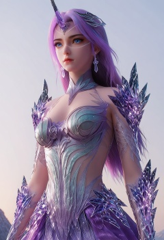 score_9,high detail,best quality,cinematic lighting,volumetric lighting,shiny skin,shiny,1girl,solo,blue eyes,long hair,hair_ornament,earrings,white background,single horn,horns,armor,crystal,simple background,breasts,closed mouth,purple hair,medium breasts,dress,multicolored hair,looking_at_viewer,upper body,thighs,<lora:QQSponyyueliuV1:0.8>,<lora:Pony_DetailV2.0:0.8>,<lora:皮肤凹痕:0.1>,