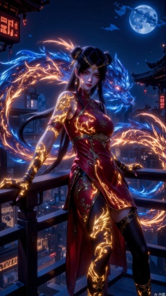 [Exquisite fine brushwork style, ultra-high definition 8K, Nikon D850 shooting texture, depth of field blur highlights the light and shadow levels, realistic skin texture mixed with luminous particle special effects, Cyber Chinese style scene modeling, and the dark parts retain rich details]. In the Oriental Cyberpunk City under the night, glass eaves and neon holographic advertisements intertwined. A cold and beautiful female assassin with dragon patterns stood sideways on the antique viewing platform, with a light black railing on her left hand, a totem tattoo on her left arm flowing with gilded fluorescent light, and her right hand put on her hip. Black leggings can be seen faintly at the split of the modified blood-red cheongsam. The moon wheel poured the blue and blue cold light on her clothes embroidered with golden silk. The orange and red neon lights on the background penetrated the mist, and formed a halo of intertwined warmth and coldness around the figure. Single bun, golden hair accessories, long black hair rises in the wind, dark golden scales extending from the corners of phoenix eyes, looking at the audience with a cold expression.lsy.