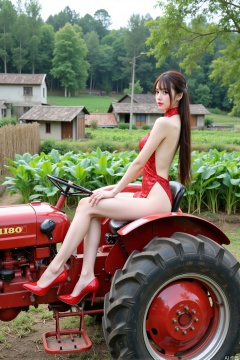 Realistic photo, one young woman, long hair, fair skin, big breasts, backless cheongsam, long legs, red high heels, full body, (driving tractor), fields, vegetable gardens, old houses, bamboo forests, countryside,
