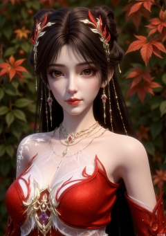 The image depicts a beautifully rendered character with long, dark hair styled in an elegant updo, adorned with intricate red and gold accessories. The character is dressed in a striking red garment that features delicate, flame-like patterns. The background consists of lush greenery with vibrant red and orange leaves, suggesting a natural, autumnal setting. The overall scene exudes a sense of fantasy and elegance, with the character appearing poised and graceful.