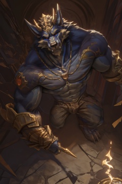 solo, 1boy, holding, jewelry, male focus, horns, necklace, staff, furry, holding staff, magic, furry male,wolf boy, character:warwick