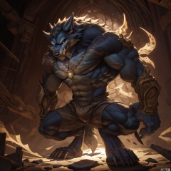 The image depicts a highly detailed and vibrant digital artwork of a muscular anthropomorphic wolf character. The wolf is adorned with intricate armor that includes glowing blue and green gemstones, emphasizing its powerful physique. The character's fur is a mix of white and blue hues, and it has sharp, pointed ears and a fierce expression. The background is dark, with swirling, ethereal light effects that enhance the mystical and powerful aura of the character. There is also a smaller, less detailed wolf character in the background, adding depth to the scene.wolf boy, character:warwick