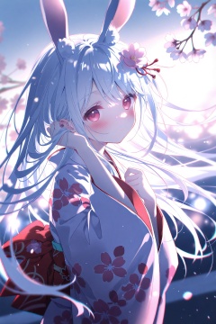 masterpiece,best quality,high quality,loli,chromatic_aberration,Blue Theme, //1girl solo long hair looking at viewer blush bangs hair ornament red eyes long sleeves bow animal ears closed mouth upper body flower white hair japanese clothes hand up hair flower wide sleeves pink eyes kimono rabbit ears from side sash floating hair bird obi floral print cherry blossoms pink flower white kimono branch print kimono,//, official art,depth of field,detailed light,blurry background,cinematic lighting,ray tracing, ultra detailed,god rays,backlighting,photo background,film grain,chromatic aberration,volumetric lighting,depth of field,blurry background,shiny skin,floating hair,cinematic lighting,day,very aesthetic,<lora:lp22:0.8>